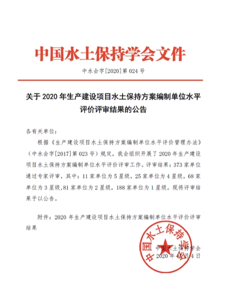 根据《生产建设项目水土保持方案编制单位平评价管理办法》规定 ,中国水土保持学会组织开展了2020 年生产建设项目水土保持方案编制单位水平评价评审工作。广西桂林青山环保科技集团有限公司通过专家评审,获得水土保持方案编制水平评价星级证书。
