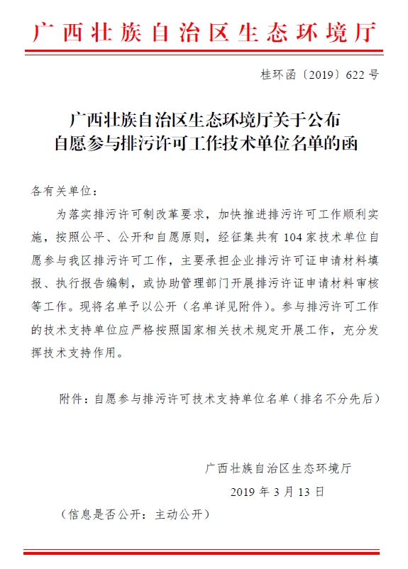 为落实排污许可制改革要求,加快推进排污许可工作顺利实施,按照公平、公开和自愿原则,经征集共有104家技术单位自愿参与我区排污许可工作,主要承担企业排污许可证申请材料填报、执行报告编制,或协助管理部门开展排污许证申请材料审核等工作。现将名单予以公开(名单详见附件)。参与排污许可工作的技术支持单位应严格按照国家相关技术规定开展工作,充分发挥技术支持作用。
